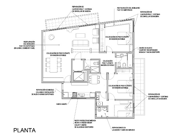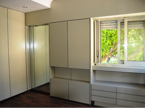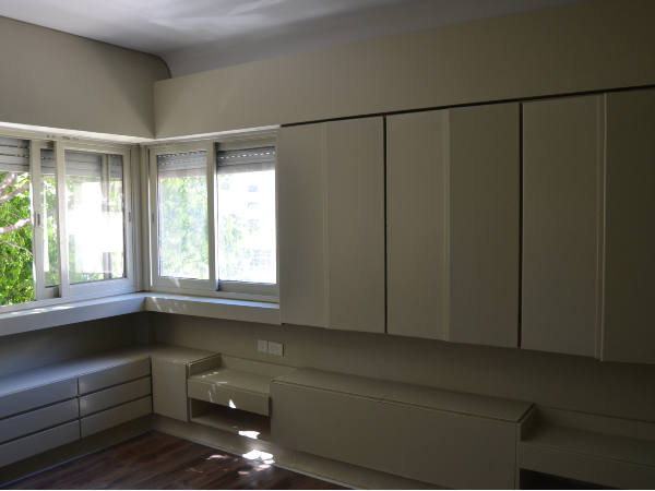 Renovación de semipiso que necesitaba actualización. La consigna fue hacerlo en un tiempo y con un presupuesto limitado. Se colocó piso flotante en el estar comedor y en los dormitorios. Además se repararon puertas, ventanas, cortinas de enrollar, mobiliario, interiores de placard y griferías. También se cambiaron tomacorrientes, teclas y se repararon luminarias. En baño principal y toilette se colocaron nuevos vanitorys. En la cocina se hizo un nuevo bajo mesada respetando el diseño y color de las alacenas existentes que fueron recuperadas. Se instaló un nuevo anafe y horno empotrado. Todo el departamento se pintó en la gama del ocre, gris y arena. En los baños y cocina los azulejos fueron pintados con pintura epoxi.
